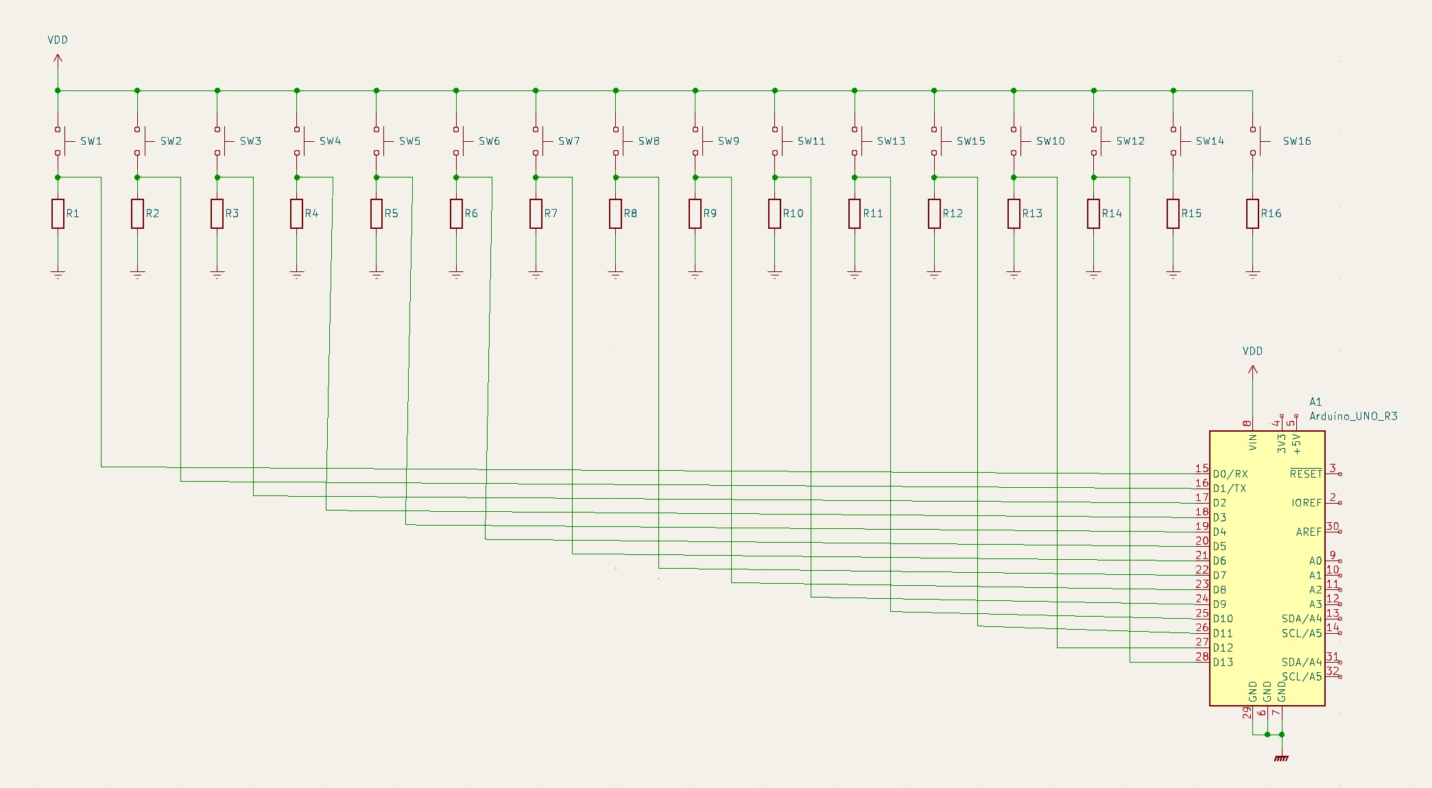 電子工作で良く使う4行x4列の計16個のスイッチをArduinoで取り込む回路です。以下は自分で失敗したことの覚書になっています。 16個のスイッチの状態をArduinoで取り込みたい時、次の回路図のようにスイッチそれぞれにポートを使うとすると、ポートが16個必要になります。 Arduino UNO R3の場合、Digital INのポートは16個なので、2個足らなくなってしまいます。