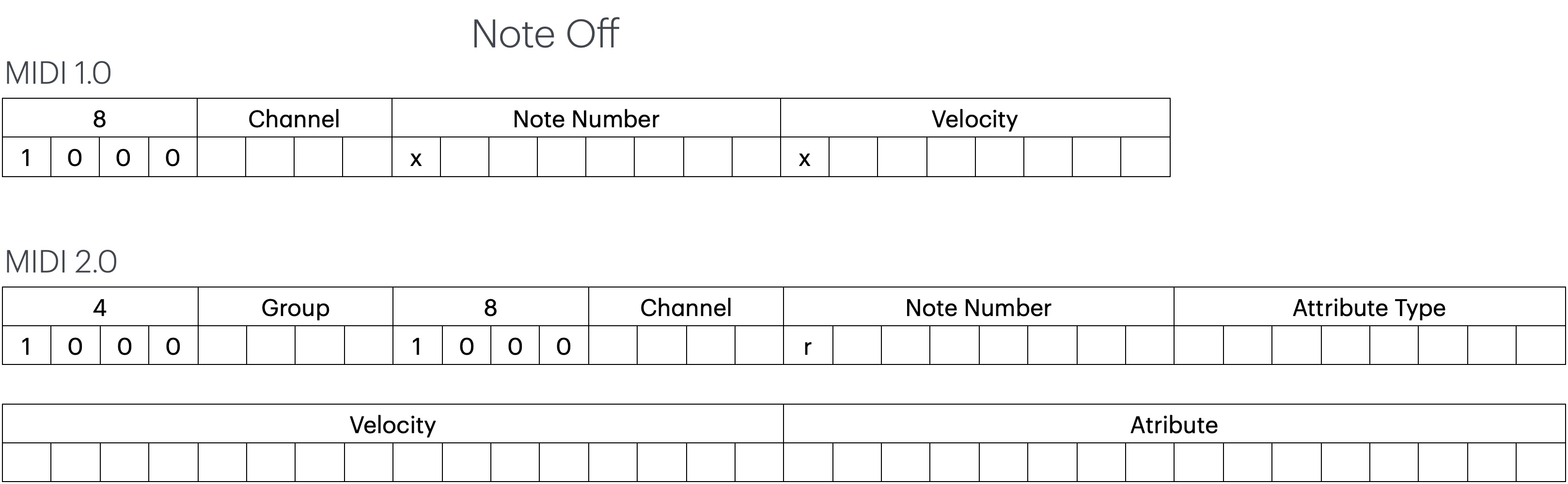 Same as Note Off, MIDI 2.0 expands velocity to 16 bits and adds new information called Attributes (8-bit type and 16-bit value).