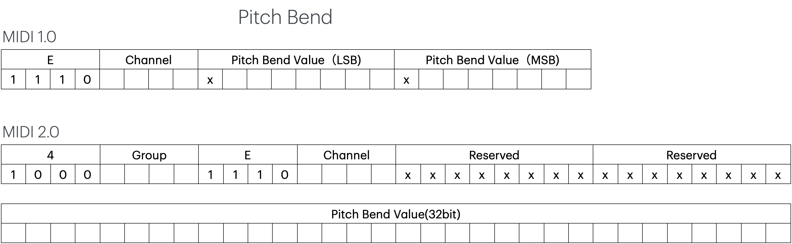 MIDI 1.0 has Pitch Bend Value precision of 14 bits, while MIDI 2.0 extends this to 32 bits.