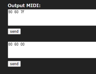 Output MIDIの下の送信ボックスにデータを記載し、sendボタンを押すとMIDIを送信します。送信ボックスも値は16進数(HEX)で記述します。送信ボックスは3つあり、どれも同じです。例えば、1つ目の送信ボックスにNote Onを記載し、次の送信ボックスにNote Offを記載し、交互にsendボタンを押す、といった事ができます。