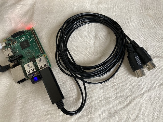 USB-MIDI変換ケーブル、手持ちのモノを つないでみました。リーズナブルなケーブルですが、難なくRaspberry Piから認識することができました。