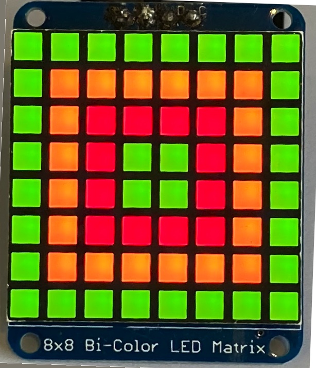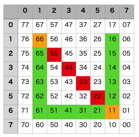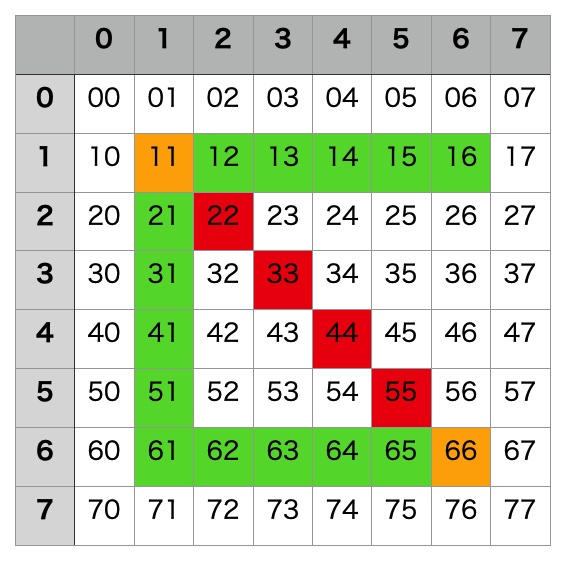 HT16K33は緑を点灯させるレジスターと、赤を点灯させるレジスターがあります。 それぞれのレジスタは、8x8bit、すなわち8byteです。 1行が1byteに相当します。 点灯させたい時は、そのビットを1に設定し、消灯はゼロとします。 オレンジを点灯させたい時は、緑と赤を両方とも1に設定します。 例えばGndDotとRndDotをそれぞれ8x8bitのメモリとします。