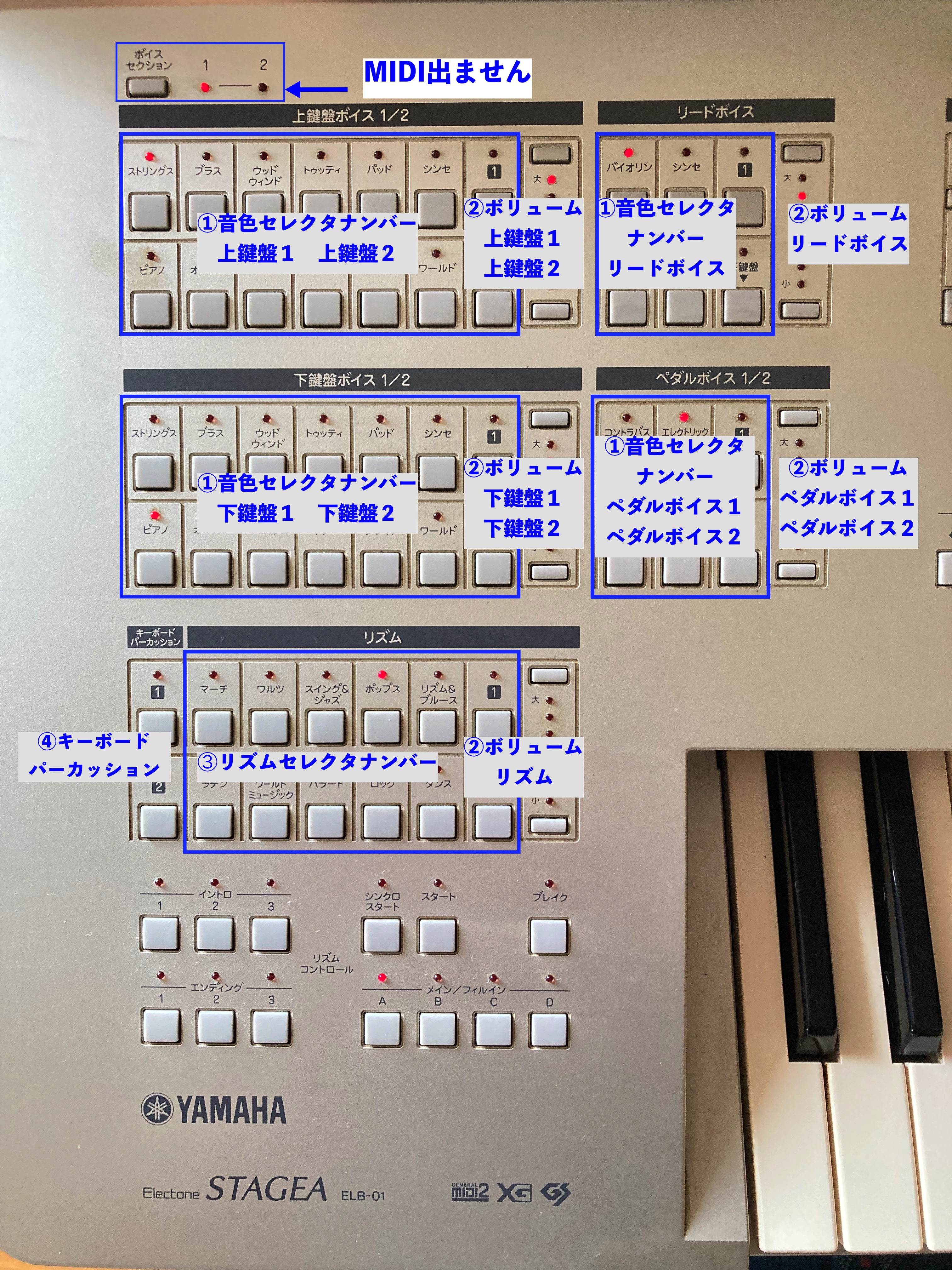 下の写真の記載は、パネルを押した時に出力されるMIDIメッセージを示しています。 なを、ボイスセクションのボタンは押してもMIDIは送信されません。